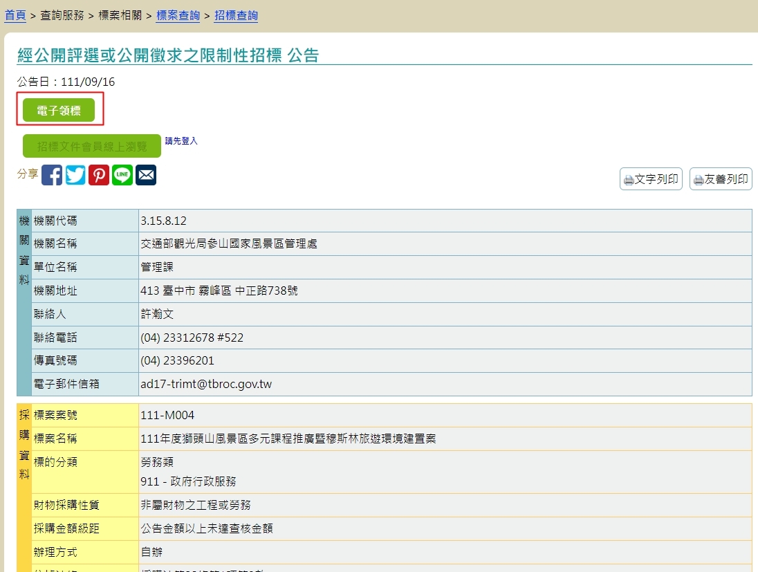 1.標案查詢:輸入查詢關鍵字例如:交通部觀光局,美食,餐飲,旅遊等字